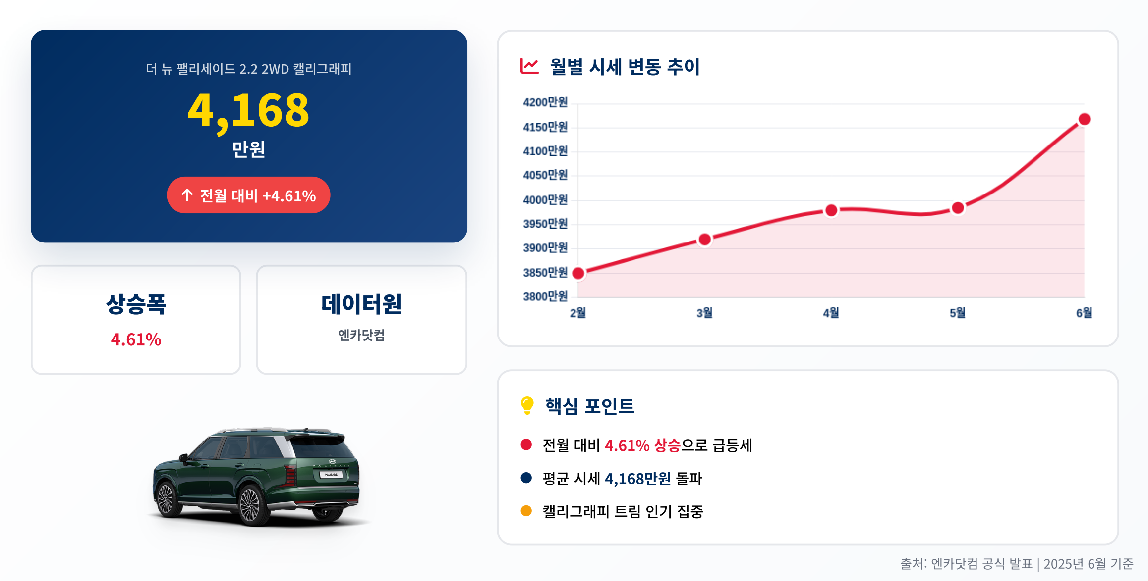 엔카닷컴 중고차 시세 2025년 6월 공식 발표 결과, 팰리세이드 중고차 가격에 놀라운 변화가 확인되었습니다.